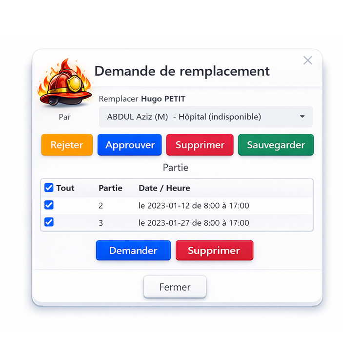 En cas d’indisponibilité, le personnel se signale simplement et peut, s’il le souhaite, proposer un remplaçant. Une liste intelligente du personnel disponible est automatiquement générée, facilitant une désignation rapide et pertinente. Il est également possible de ne désigner personne : les collaborateurs disponibles peuvent alors se porter volontaires pour assurer le remplacement sur la mission concernée. Le remplacement peut couvrir l’intégralité de la mission ou seulement certains créneaux, selon les besoins opérationnels. Grâce à cette flexibilité, la gestion des remplacements devient quasi autonome, garantissant une continuité d’activité fluide et une organisation toujours performante. ✔️ Les atouts clés :