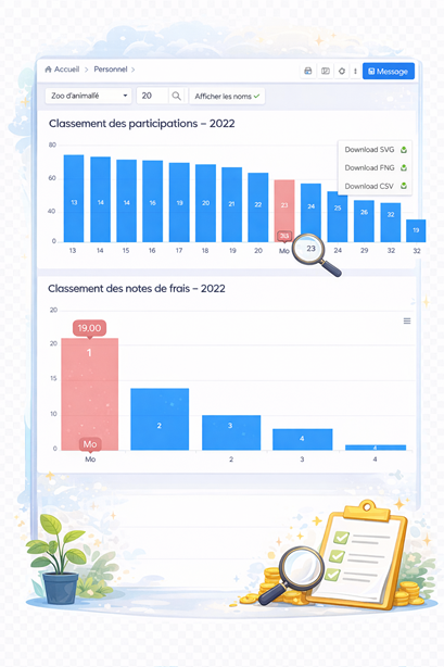 Sur ces statistiques sont illustrés plusieurs points représentatifs de son activité. D’une part, on y retrouve les données chiffrées de son taux de participation et son évolution sur l’année, un graphique sur le type de participation auxquels il a le plus contribué, le classement de ses participations et des notes de frais déposées par rapport aux autres personnes de l’organisation. Les données se mettent à jour instantanément et automatiquement sur les graphiques grâce à l’interconnectivité du logiciel entre les statistiques et les autres fonctionnalités.